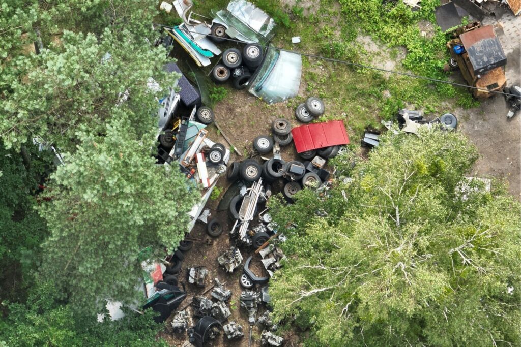 W ramach podjętych czynności stwierdzono na posesji kilkaset pojazdów będących w różnym stopniu zdemontowanych oraz znaczną ilości części samochodowych w tym zużyte opony czy fragmenty wiązek przewodów elektrycznych, tapicerek samochodowych oraz odpadów z tworzyw sztucznych ułożonych bezpośrednio na gruncie.