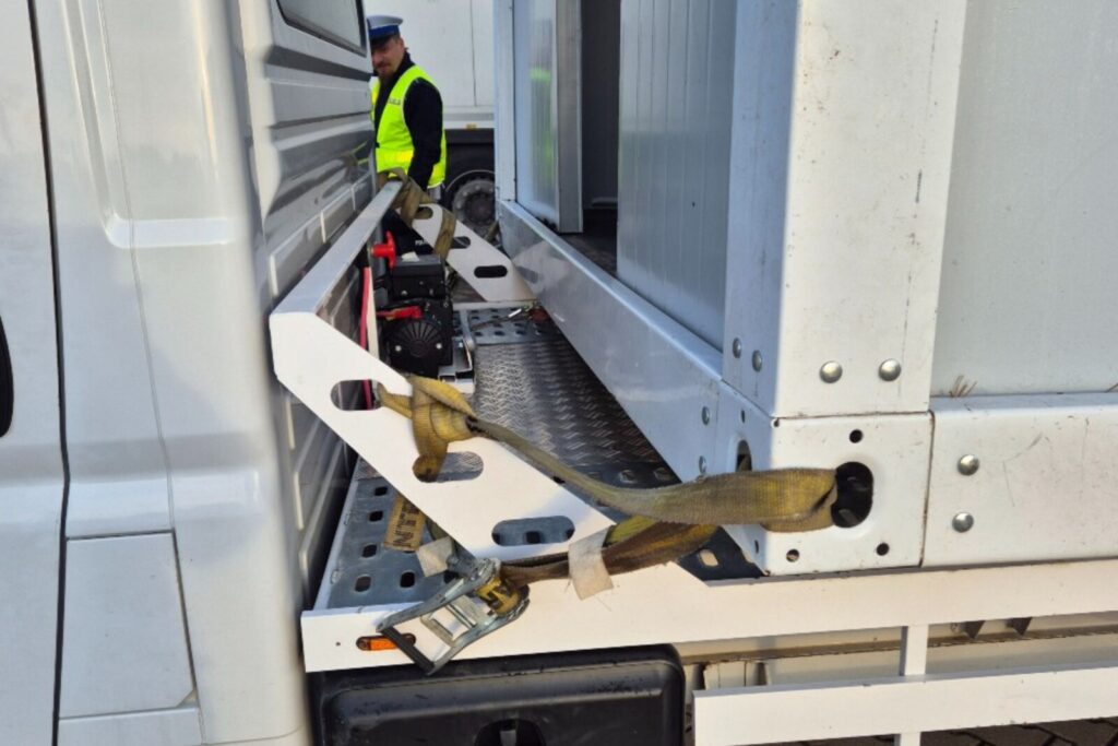 Autolawetą na podwoziu Fiata Ducato przewożony był kontener biurowy a „Krokodyle” stwierdzili – tutaj cytat – „rażące zaniedbania w zakresie zabezpieczenia umieszczonego na nim ładunku.
