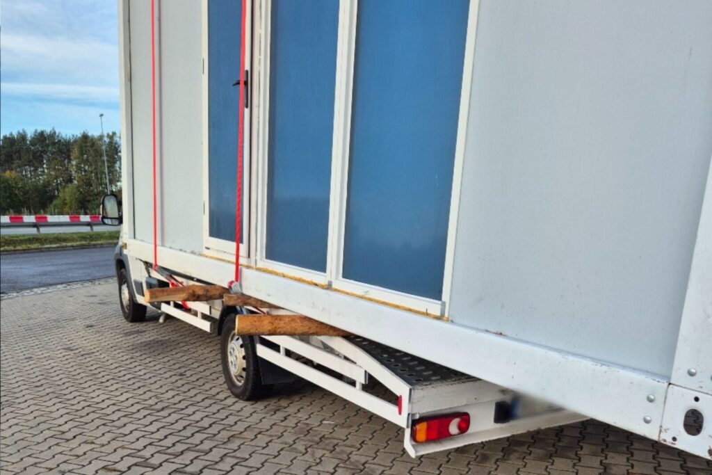 Wspomniany kontener biurowy osadzono na stemplach budowlanych a następnie zamocowano za pomocą pasów transportowych m.in. do niskiej wieży za kabiną „X250-tki”. W efekcie doszło do znacznego przemieszczenia się kontenera, co – według inspektorów ITD – miało wpływ na stateczność pojazdu.