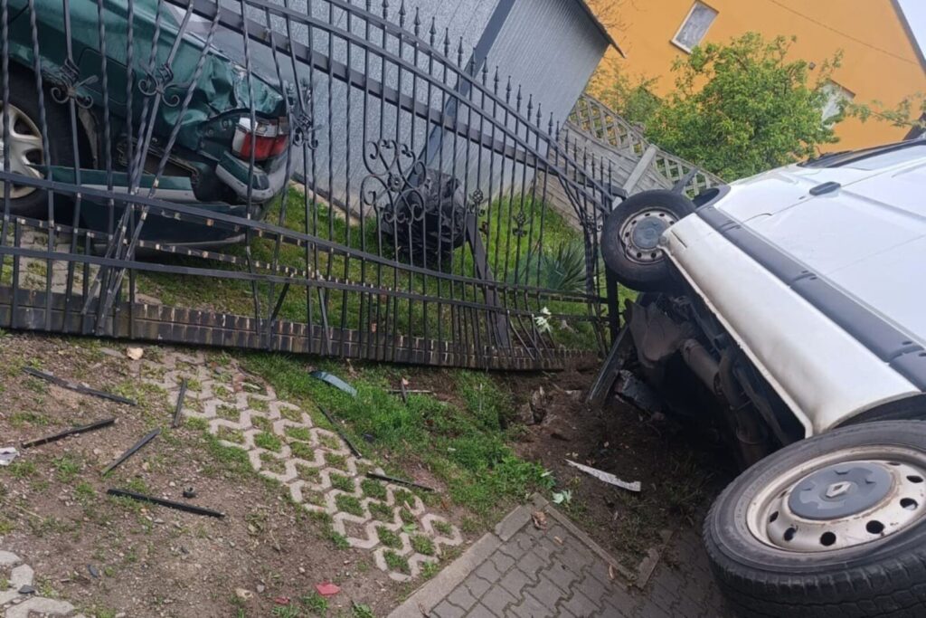 Uderzenie było na tyle mocne, że kuty, metalowy płot przewrócił się i uszkodził zaparkowaną Mazdę 626 właściciela posesji.