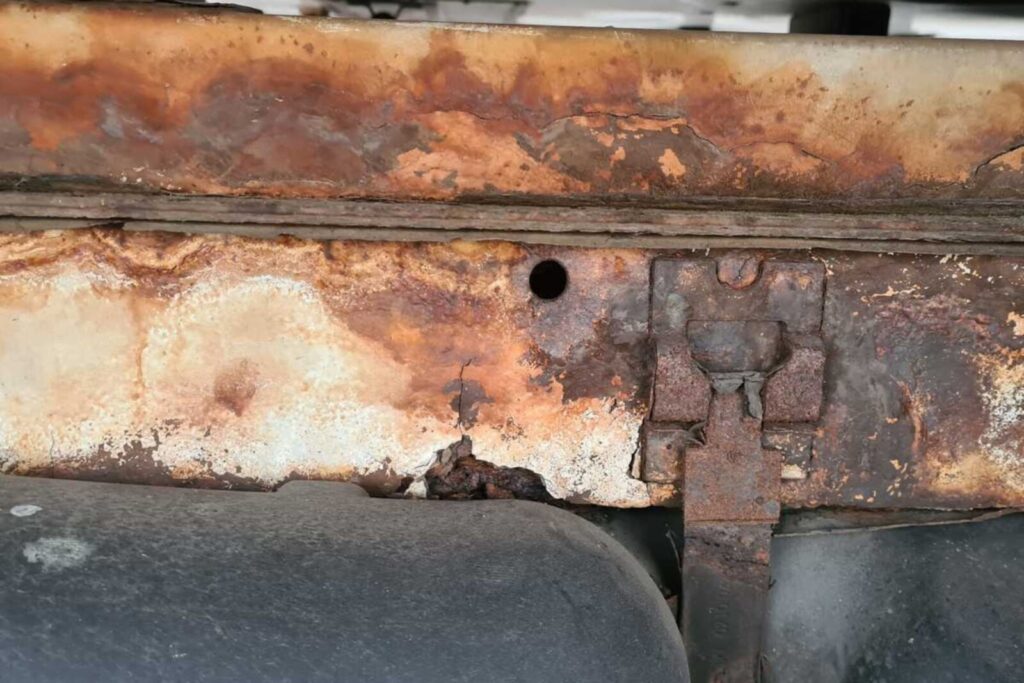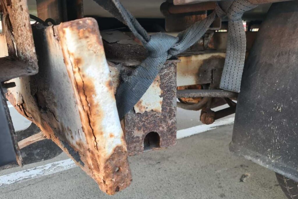 W trakcie weryfikacji stanu technicznego policjanci „drogówki” zauważyli liczne pęknięcia elementów nadwozia, korozję elementów nośnych pojazdu oraz znaczny wyciek oleju z silnika.