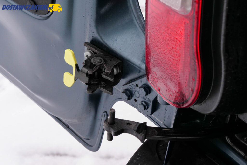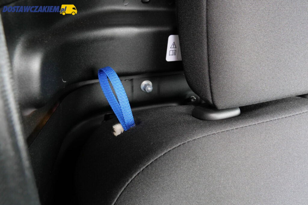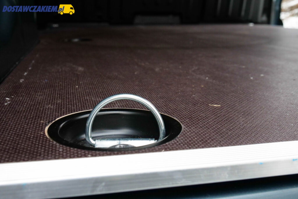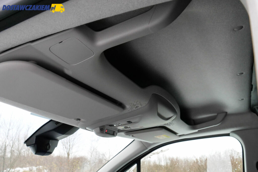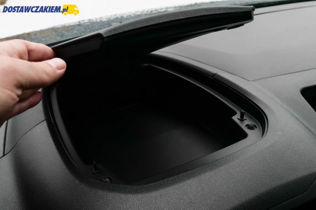 Mamy zamykany schowek przed kierowcą na podszybiu, mamy półkę podsufitową, gdzie pomieści się spokojnie kilka pasów transportowych i kątowników. Są nawet dwa haczyki na kamizelkę odblaskową czy kurtkę na ścianie grodziowej.