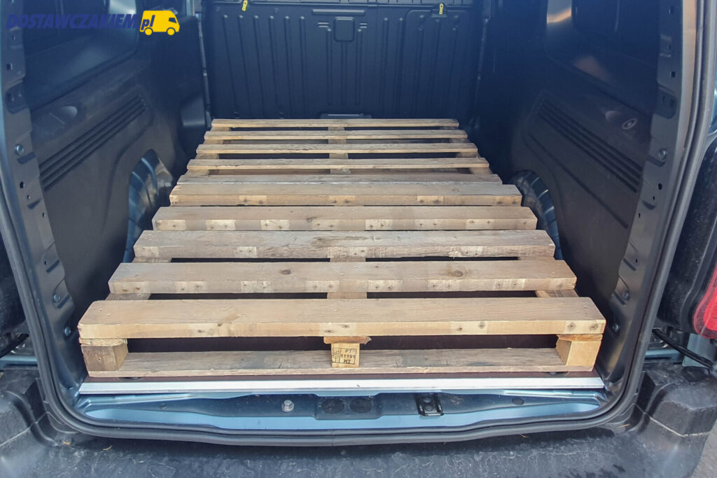 Maksymalna szerokość paki przy prawych przesuwnych drzwiach wynosi 1630 mm oraz 1229 mm pomiędzy nadkolami, więc na styk do ładowni Berlingo XL załadujemy dwie europalety EPAL (1200×800 mm).