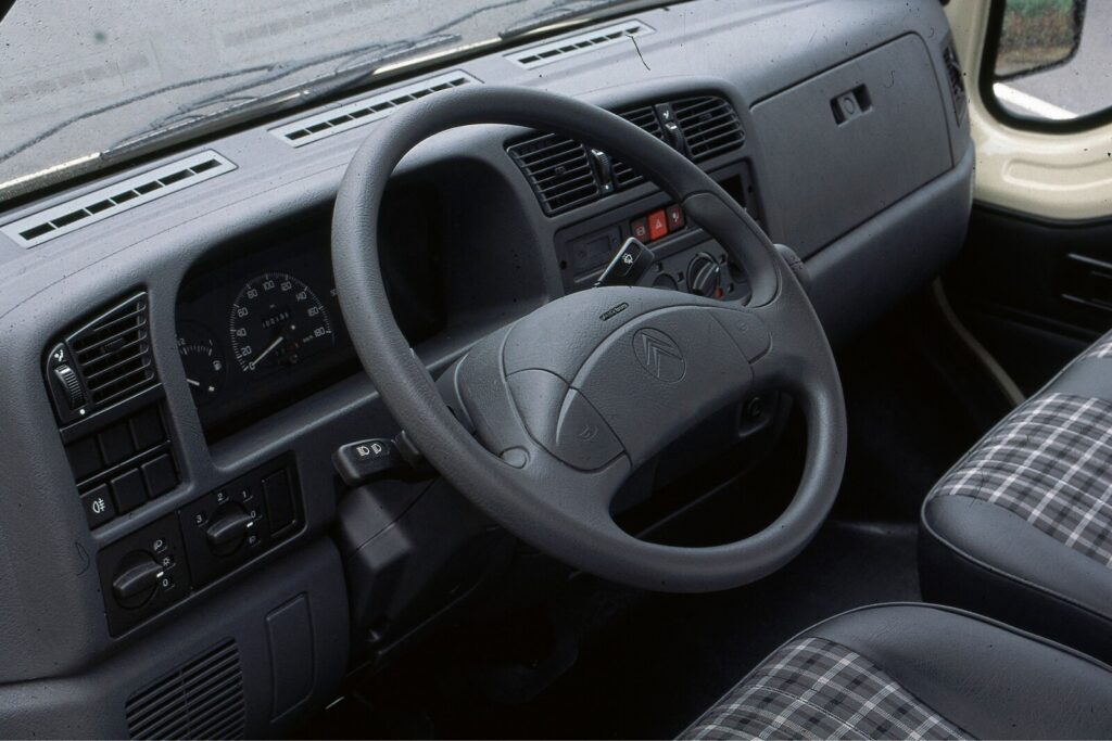 Citroen Jumper serii 230 pojawił się w 1994 roku i w zasadzie do dzisiaj w „sevelkach” znajdziemy dźwignię zmiany biegów obok przy kierownicy oraz dźwignię zmiany biegów po lewej stronie fotela kierowcy. Na zdjęciu Jumper z poduszką powietrzną na kierownicy.