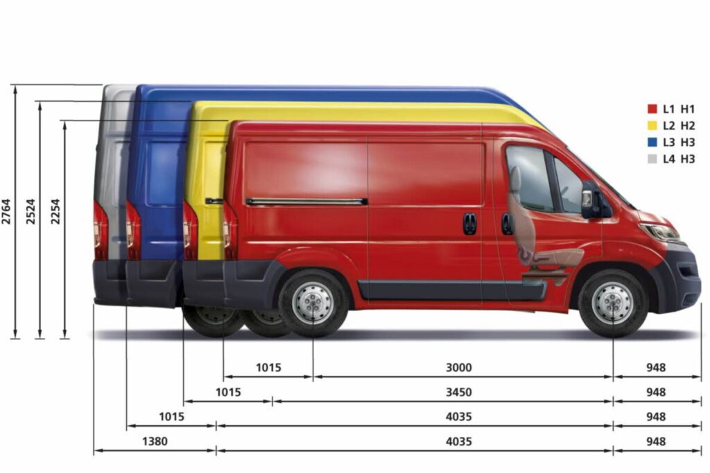 W przypadku „X250-tki” ówczesne PSA (Citroen/Peugeot) oraz Fiat przygotowali 3 rozstawy osi (3000, 3450 i 4035 mm) oraz warianty „balszek” od L1H1 do L4H3 a największy z furgonów oferował w 2006 roku a i oferuje po dziś dzień zresztą 17 m3 pojemności ładowni.