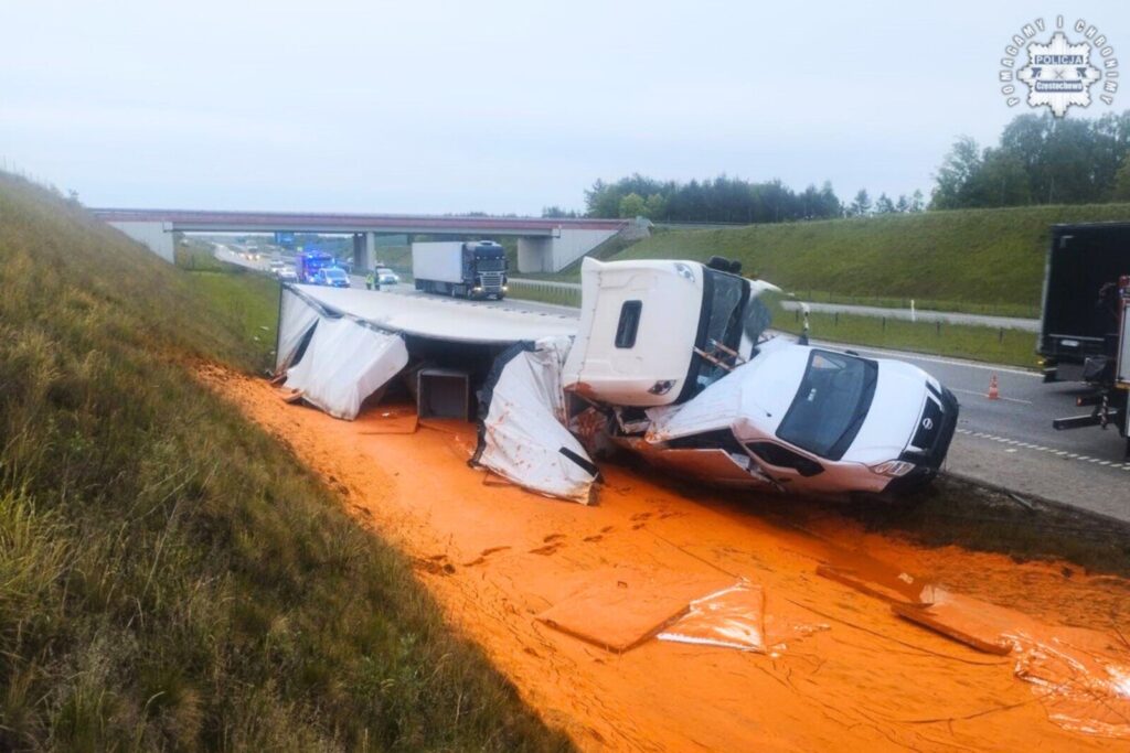 Do tego z naczepy wylała się znaczna zawartość znajdujących się tam pojemników z około 20 ton sosu pomidorowego. Na miejscu przez kilka godzin pracowali policjanci, którzy będą teraz wyjaśniać dokładne przyczyny i okoliczności tego zdarzenia.