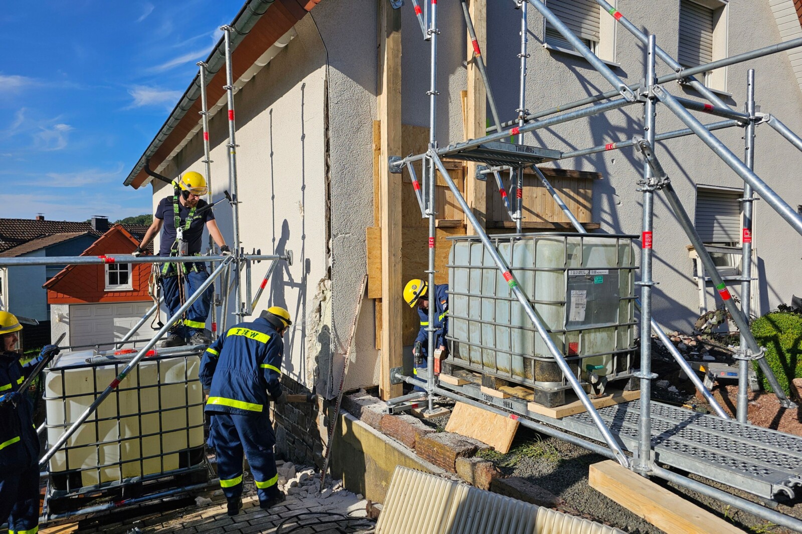 Na miejscu pojawiła się grupa THW (Federalna Służba Ratownictwa Technicznego), która podczas trwającej blisko 8 godzin akcji zabezpieczyła uszkodzone ściany domu drewnianymi podporami od wewnątrz dodatkowo zakładając od zewnątrz specjalne rusztowania obciążonymi wypełnionymi wodą mauzerami.
