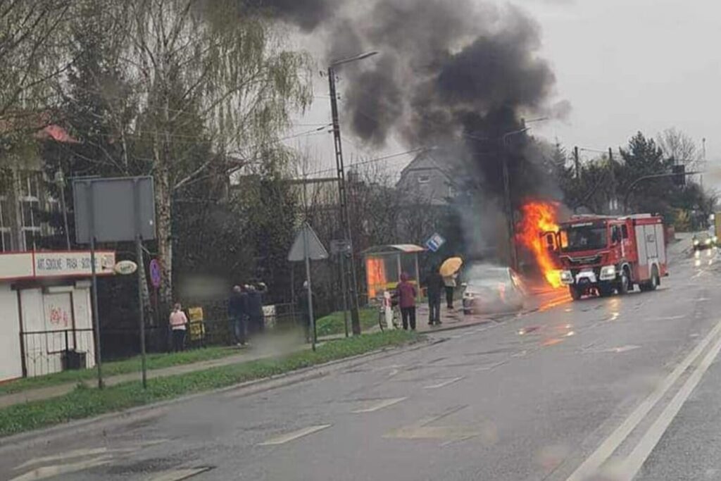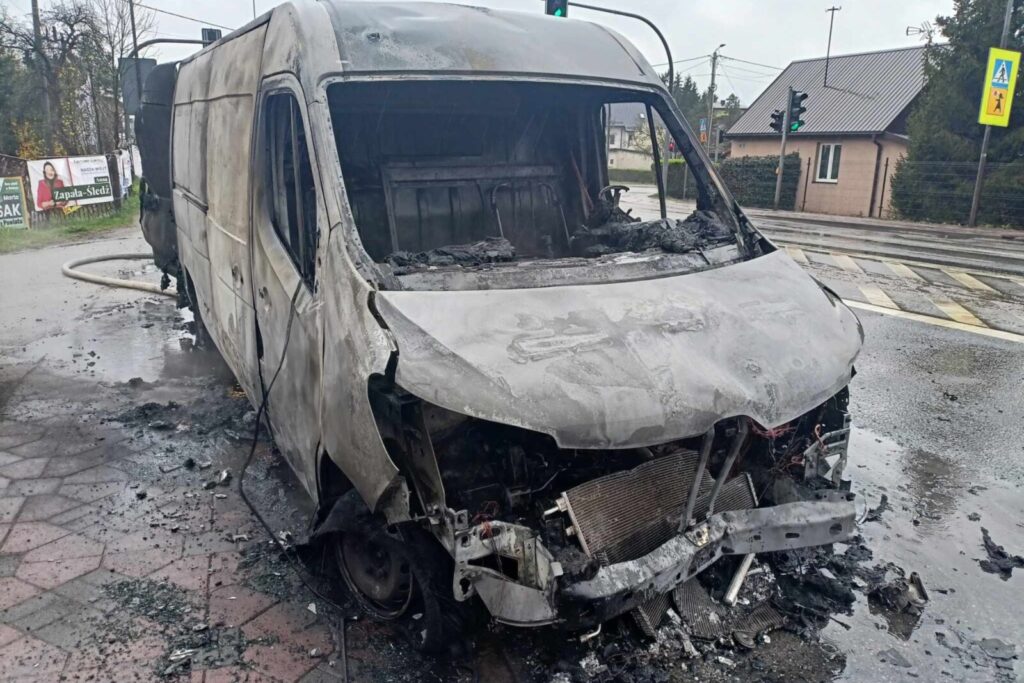 Pod Kielcami doszło do kolizji dwóch pojazdów w wyniku czego doszczętnie spłonęło dostawcze Renault Master. A zaczęło się od pieszego.