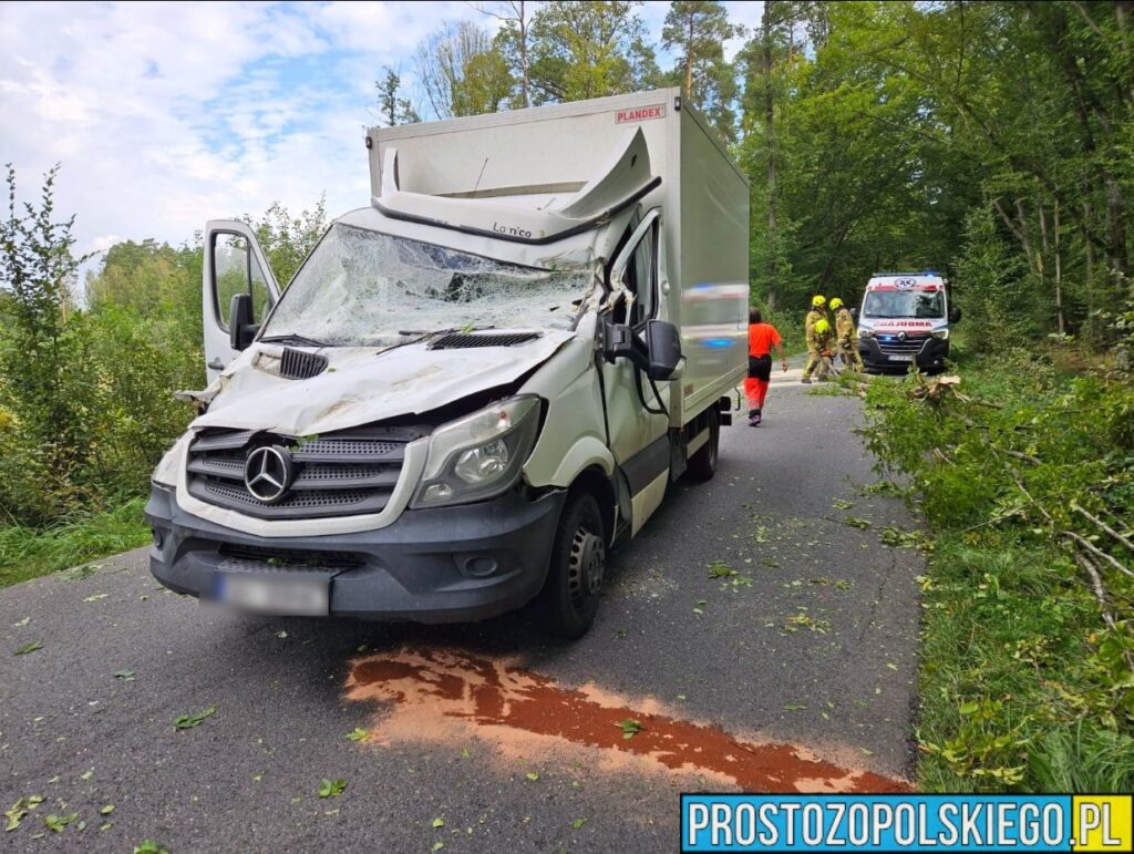 Pod Opolem spadające przydrożne drzewo zmiażdżyło kabinę przejeżdżającego Mercedesa Sprintera. O dziwo, kierowca wyszedł z tego cało!