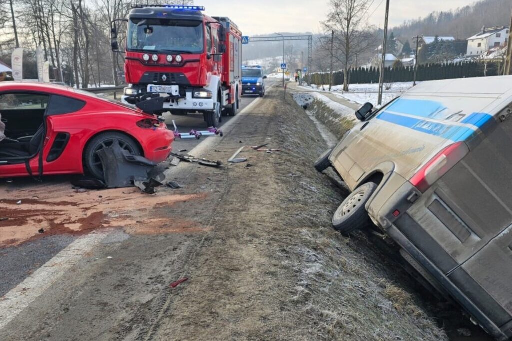 W piątek 20 lutego pod Strzyżowem miało miejsce niebezpieczne zdarzenie z udziałem dostawczego Fiata Ducato, sportowego Porsche 718 Cayman GT4 RS oraz 40-tonowego zespołu pojazdów.