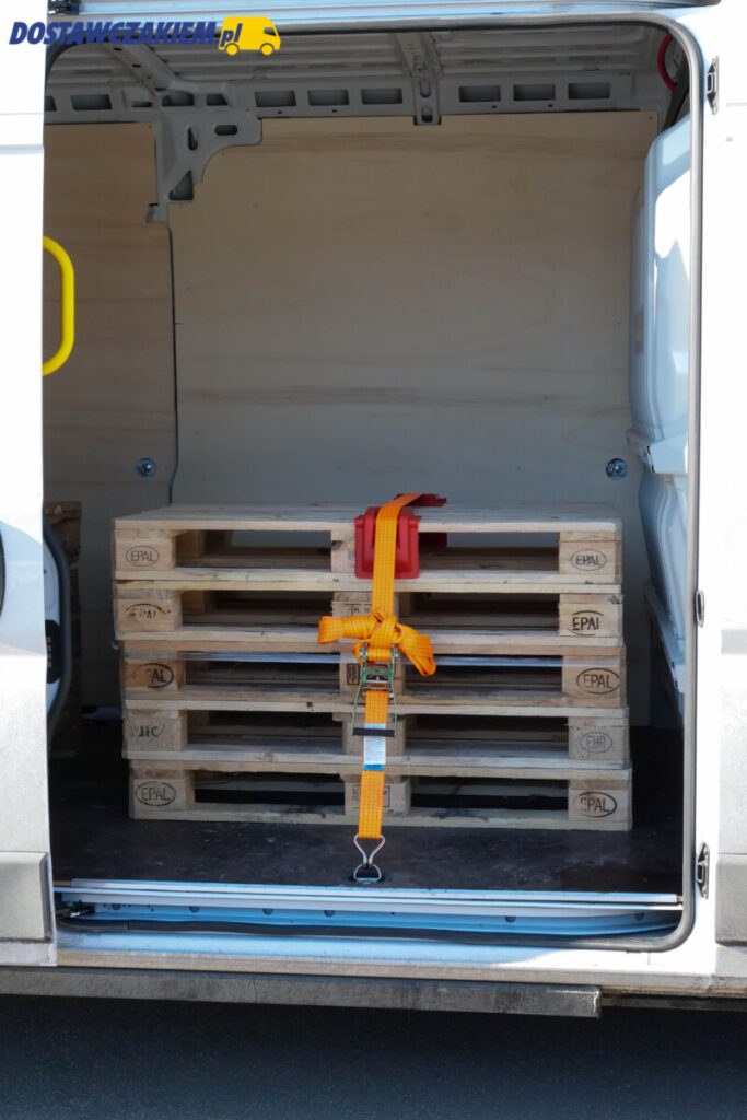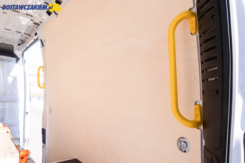 Fiat Professional podaje, że „goła” paka L3H2 oferuje maksymalnie 3705 mm długości (po podłodze), ale w połowie wysokości paki mamy do dyspozycji już nieco mniej, bo 3555 mm – to oczywiście kwestia wchodzącej nieco w głąb ładowni ścianki działowej (widać to idealnie na zdjęciu głównym). Wysokość wewnątrz ładowi (bez sklejki na podłodze) dochodzi do 1932 mm.