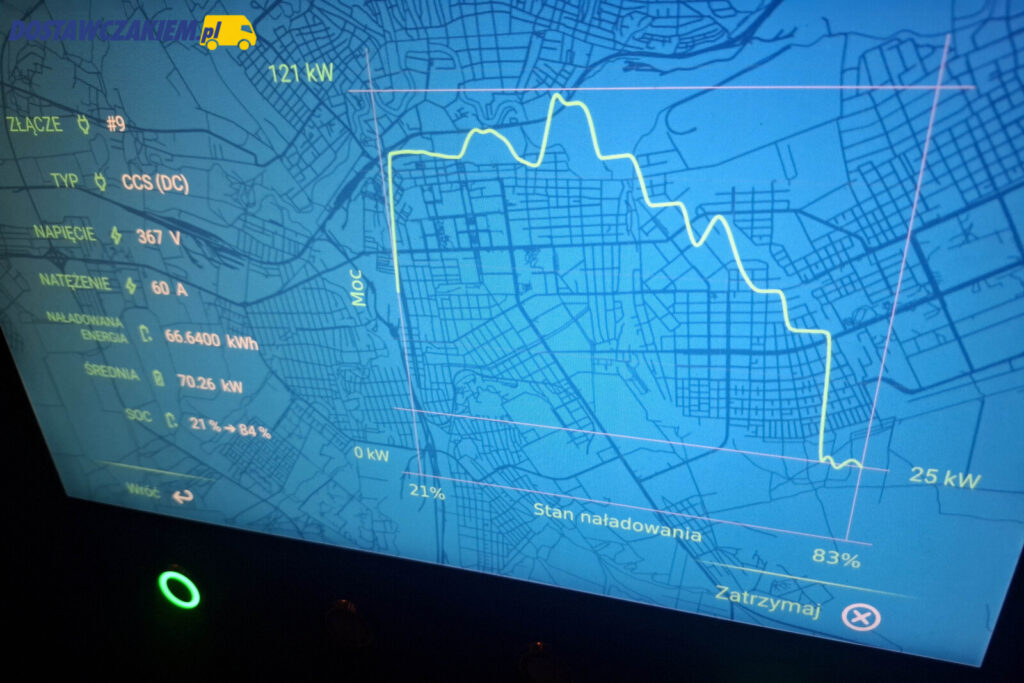 Ładowanie w Nowym Ciechocinku trwało dokładnie 65 minut a średnia prędkość ładowania oscylowała w granicach 100 kW dochodząc w szczycie do 138 kW, a zatem naprawdę nieźle, jak na -5°C. Trzeba jednak podkreślić, że przy 80% SoC krzywa ładowania spadał do najczęściej 22 kW, więc najsensowniej po prostu ładować elektrycznego „Dukata” właśnie do poziomu 80%.