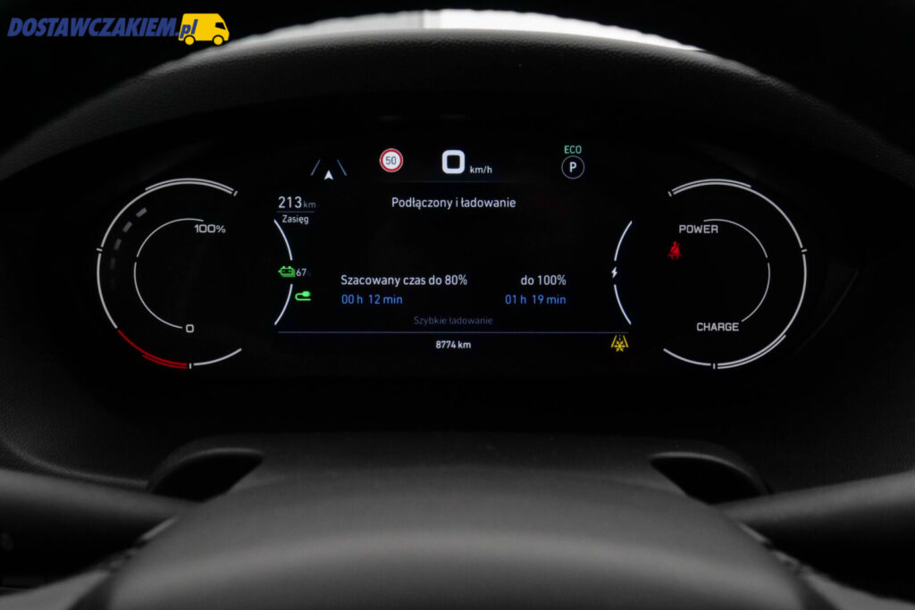 Szkoda tylko, że fabryczny 7-calowy cyfrowy zestaw wskaźników nie pokazuje aktualnej mocy ładowania. Owszem, informuje o szacowanym czasie do osiągnięcia 80% i do 100% doładowania baterii trakcyjnej a także pokazuje teoretyczny zasięg, który sukcesywnie rośnie.
