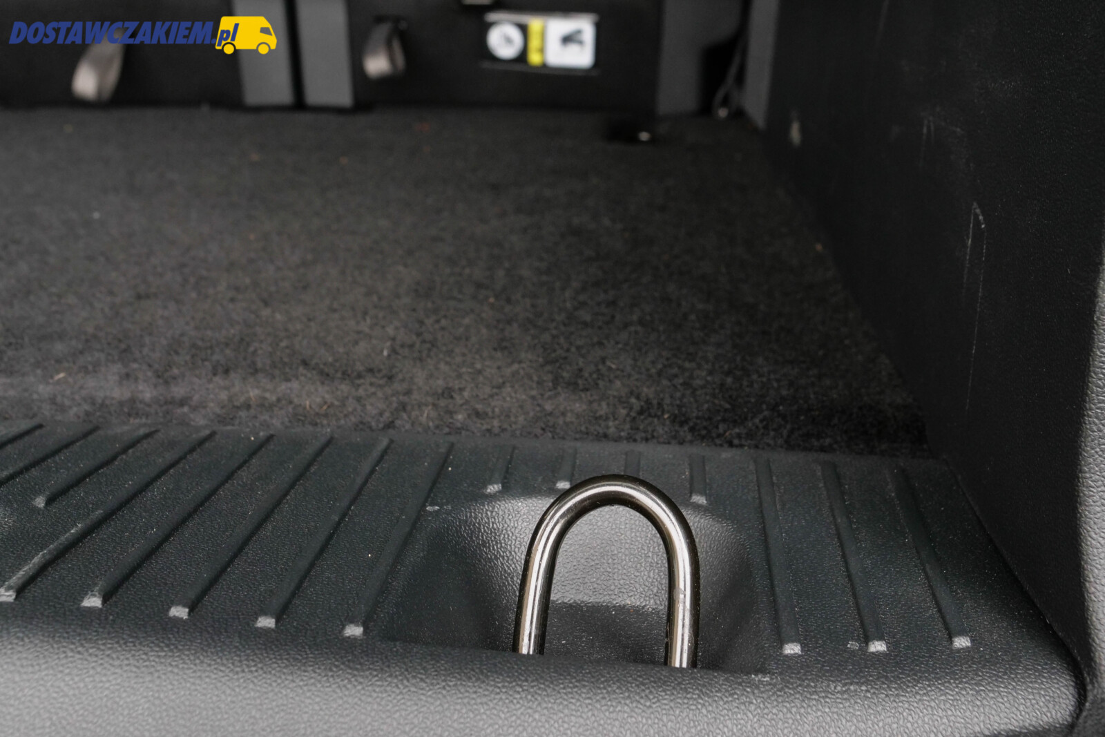 Szerokość przestrzeni ładunkowej między nadkolami to 1172 mm, więc nawet awaryjnie nie wsadzimy tutaj europalety dłuższym bokiem. Na plus zaliczyć można jednak schowek po prawej stronie bagażnika (zmieści się tam naprawdę sporo), haczyki, gdzie powiesić można choćby siatki z zakupami.