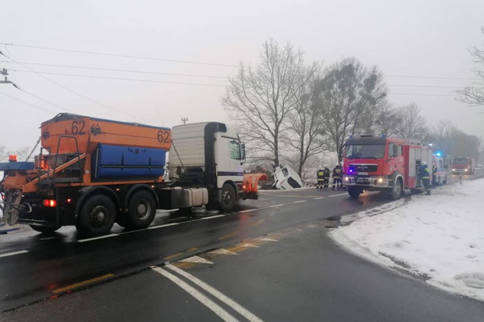 W niedzielny poranek na DW 214 Ford Transit wjechał w pługopiaskarkę – ranny pasażer z minibusa trafił do szpitala.