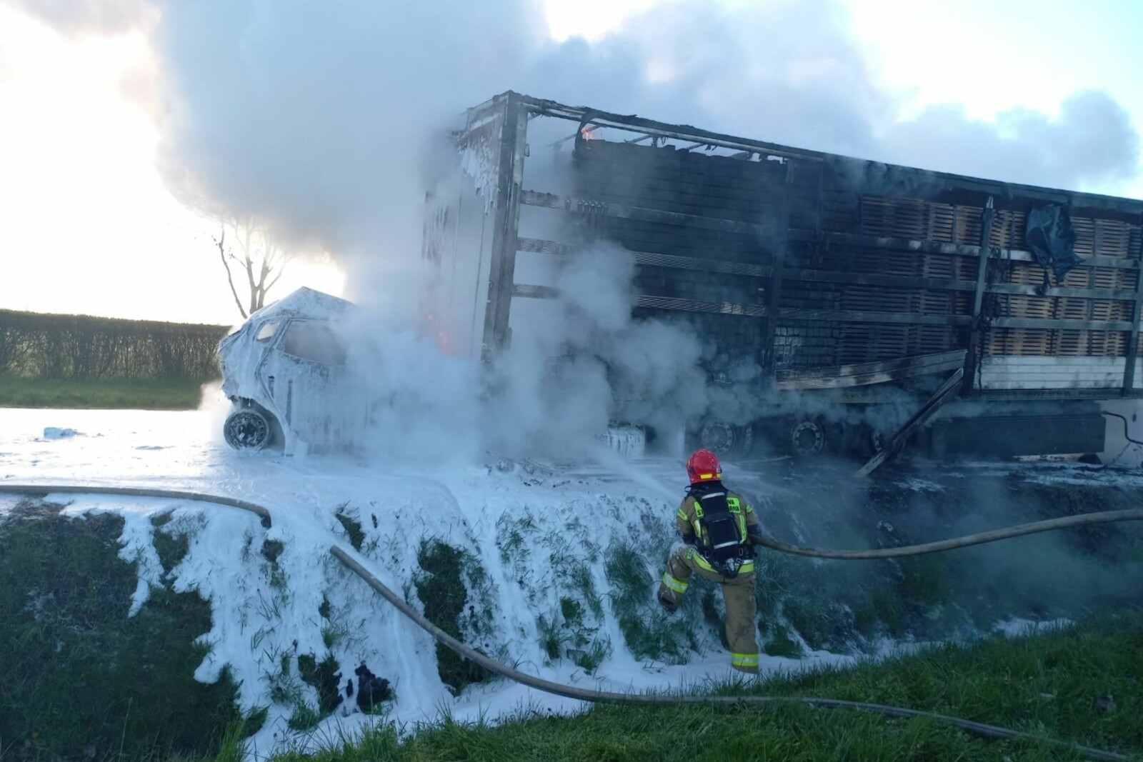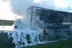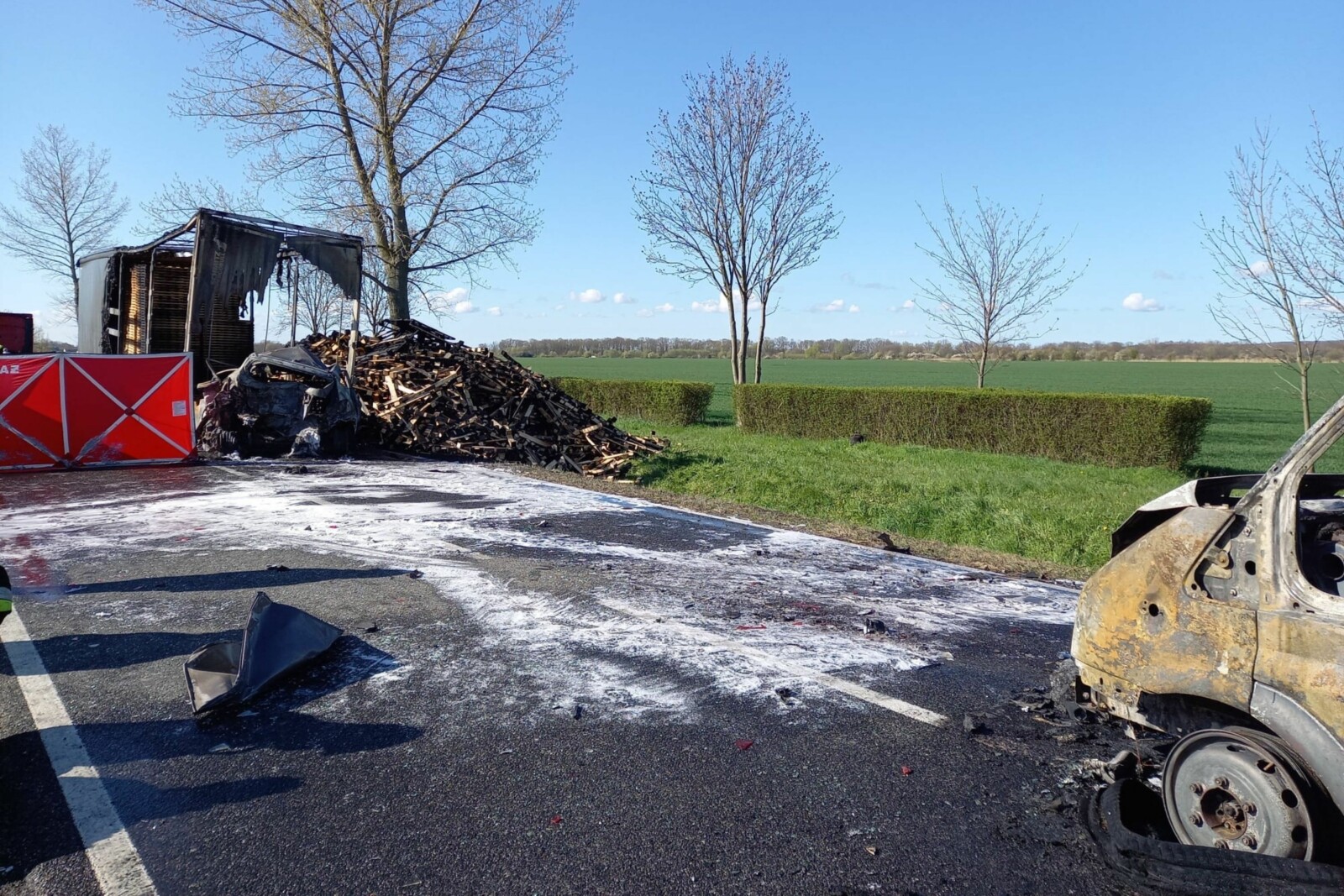 Dostawczy Ford Transit wbił osobowego Hyundaia pod naczepę na DK 31, po czym doszło do pożaru. Na miejscu zmarł kierowca osobówki.