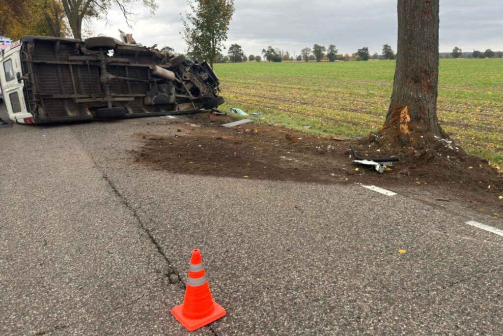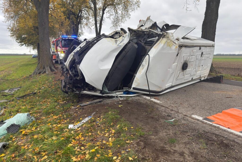 Po przybyciu na miejsce wypadku potwierdzono, że na lewym boku leży dostawcze Iveco Daily a kierowca furgonu jest zakleszczony w kabinie.