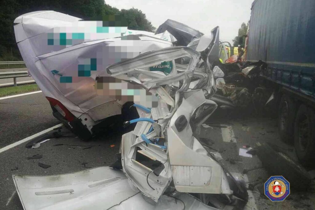 Furgon w strzępach po wypadku z 40-tonowym zestawem na słowackiej „ekspresówce”. Ciężko w to uwierzyć, ale 30-letni kierowca vana przeżył!