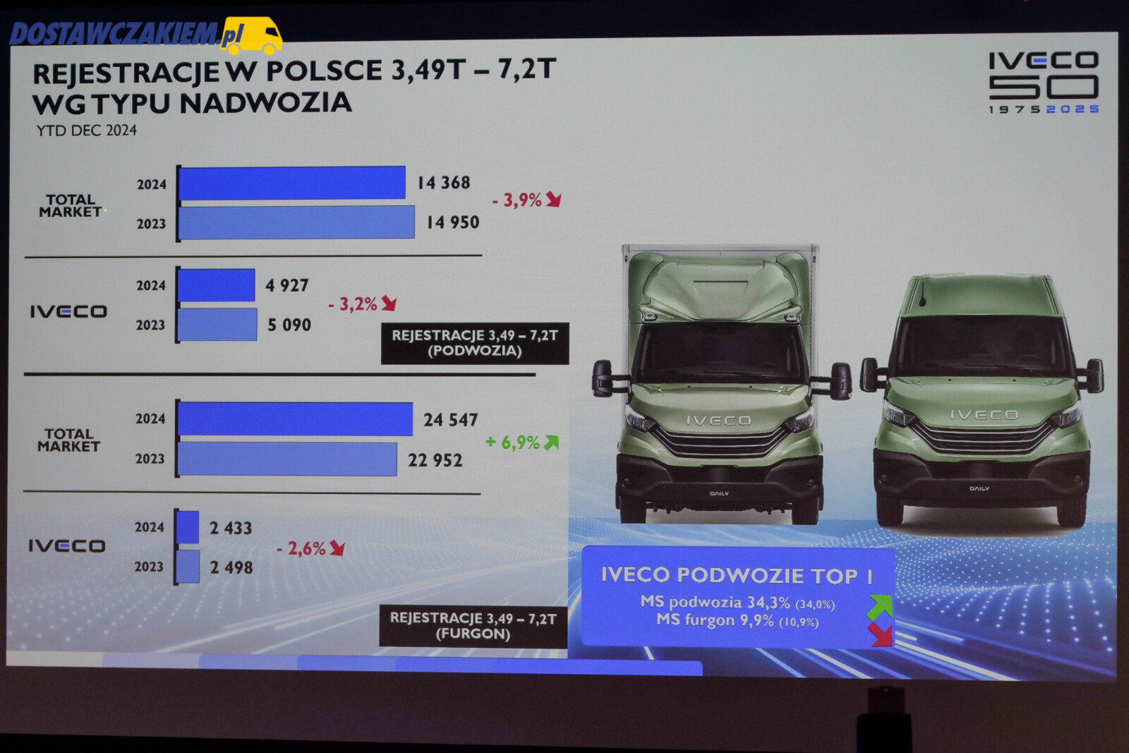 Rejestracji Iveco Daily do 3,49 t (tak podawano na konferencji) było w 2024 roku 8333 szt. a to o 8,5% mniej w porównaniu do 2023 roku.