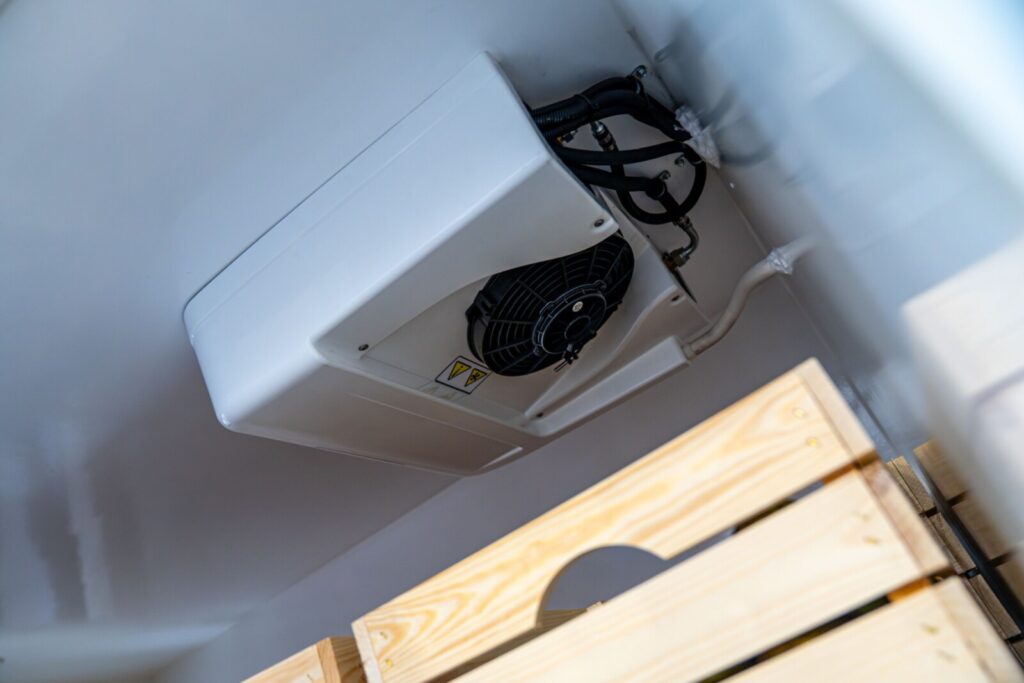 Na szczególną uwagę zasługuje podłoga izolowana o grubości 50 mm, wykończona trwałą wylewką żywiczną aż do wysokości nadkoli. Rozwiązanie to znacząco zwiększa odporność na uszkodzenia mechaniczne oraz ułatwia utrzymanie czystości – kluczowy aspekt w transporcie produktów spożywczych.
