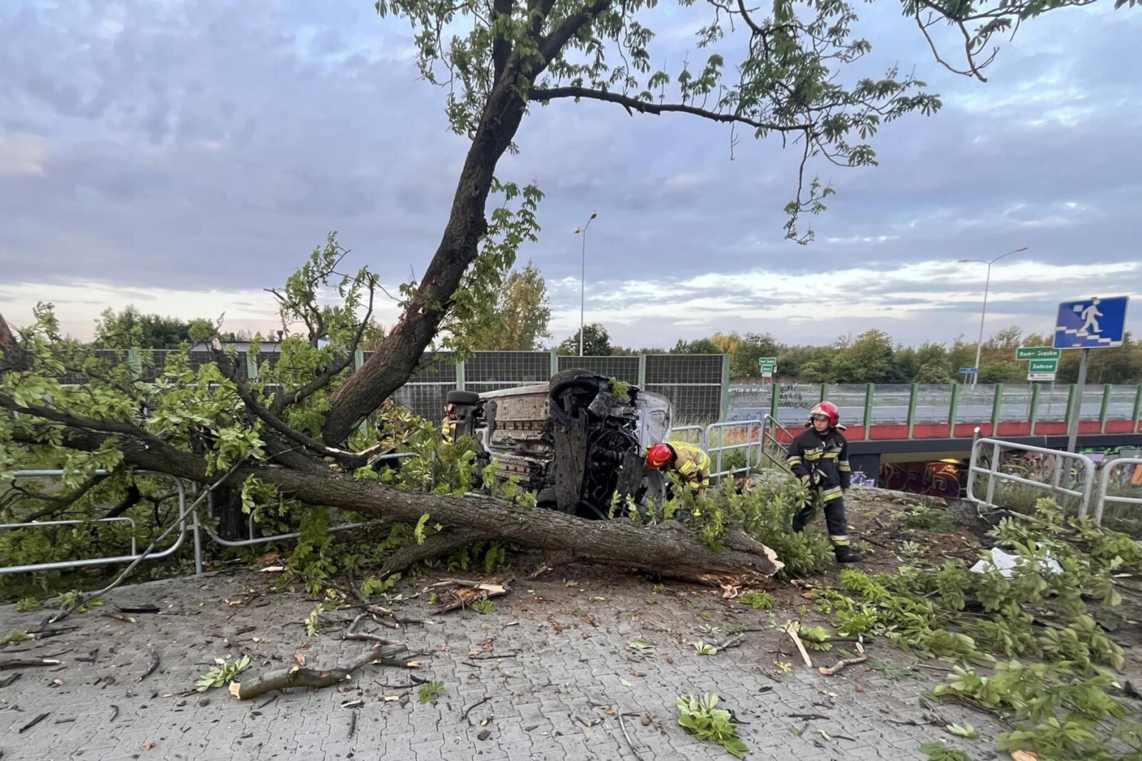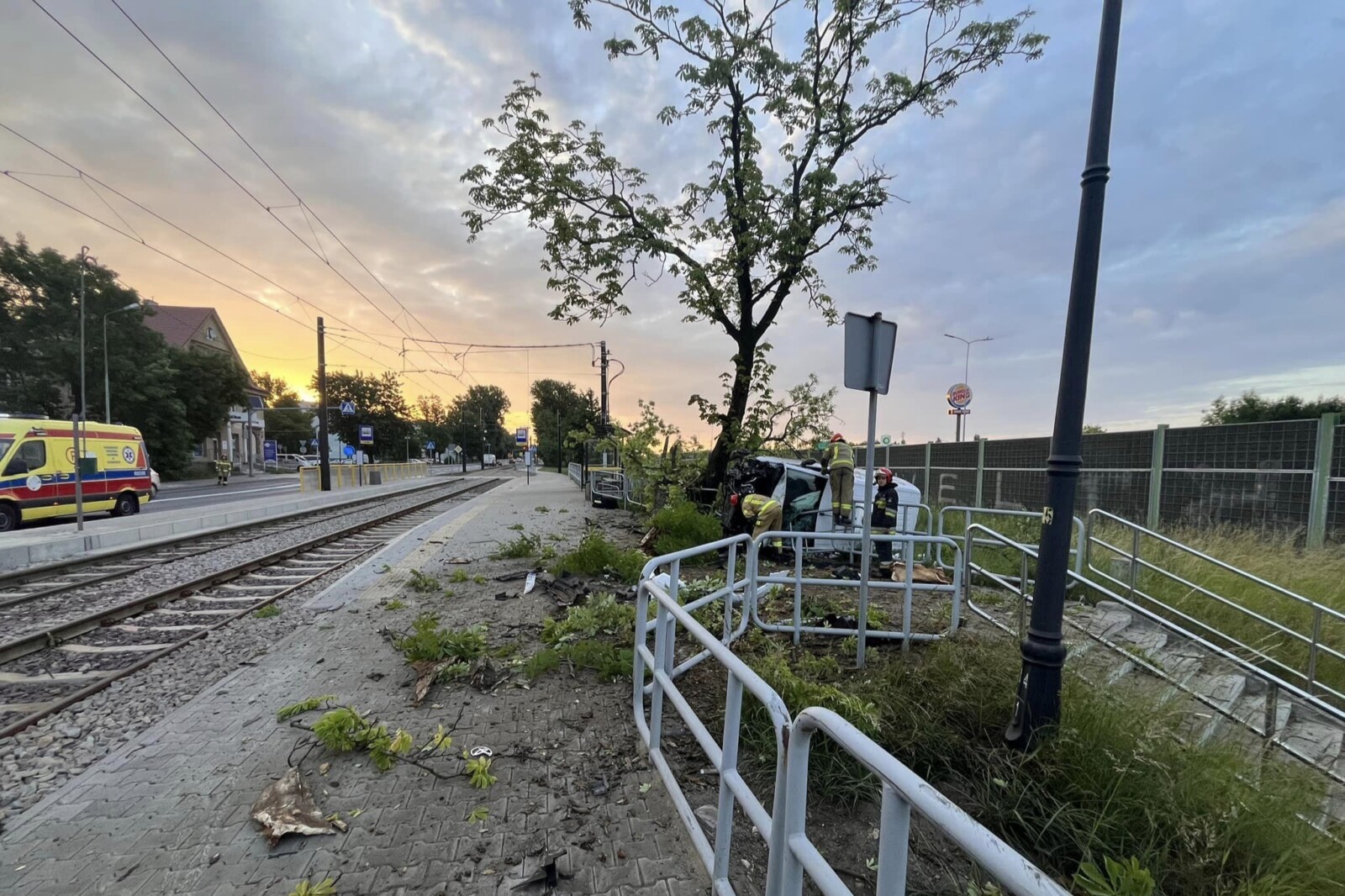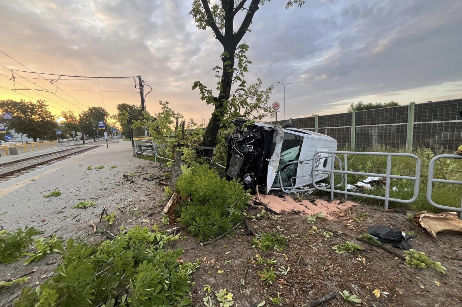 W konsekwencji pojazd zjechał na prawo, wjeżdżając na pas zieleni pomiędzy DTŚ a ulicą Zabrzańską. Ostatecznie van zatrzymał się na drzewie tuż obok przystanku – na szczęście ze względu na wczesną porę nie było tam osób czekających na tramwaj.