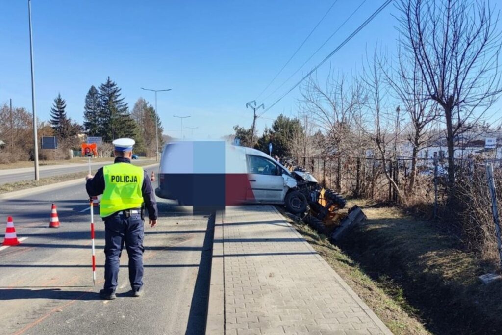W wyniku uderzenia w tył maszyna zjechała do rowu a kierowca koparki z obrażeniami ciała został przewieziony do szpitala – na szczęście mężczyźnie nic poważnego się nie stało.