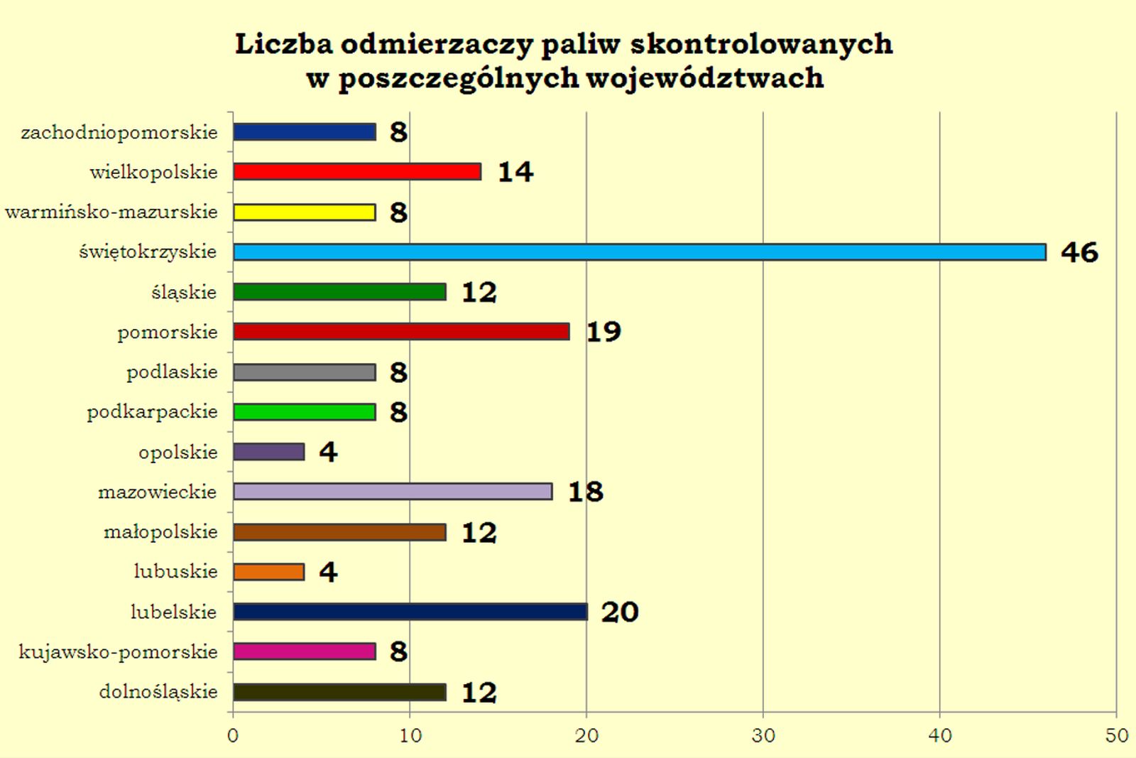 Najwięcej stacji sprawdzono w województwie łódzkim (8 punktów), a najmniej w lubuskim (tylko 2 punkty). Pod względem skontrolowanych urządzeń wybija się wyraźnie województwo świętokrzyskie (46 odmierzaczy). Na ostatnim z kolei miejscu są województwa opolskie i lubuskie (po 4 odmierzacze).