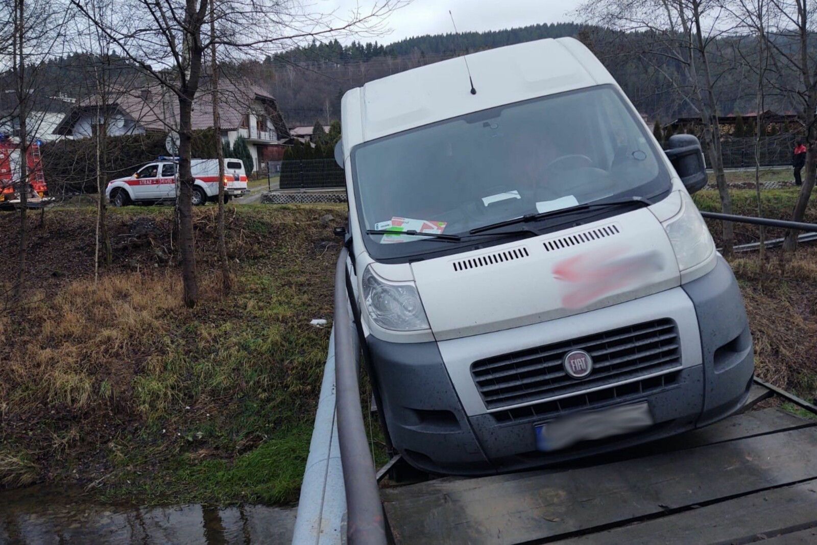 Do nietypowej sytuacji doszło około godziny 13:30. Kurier prowadzący Fiata Ducato próbował przejechać przez mały mostek prowadzący do jednego z prywatnych domów nad rzeką Kamionką.