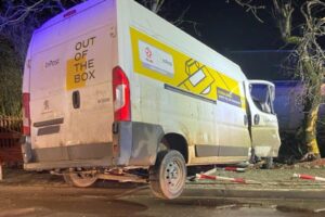 Ostatecznie furgon przebił ogrodzenie posesji i uderzył w drzewo a kierowca Boxera został zakleszczony w mocno zdeformowanej kabinie.