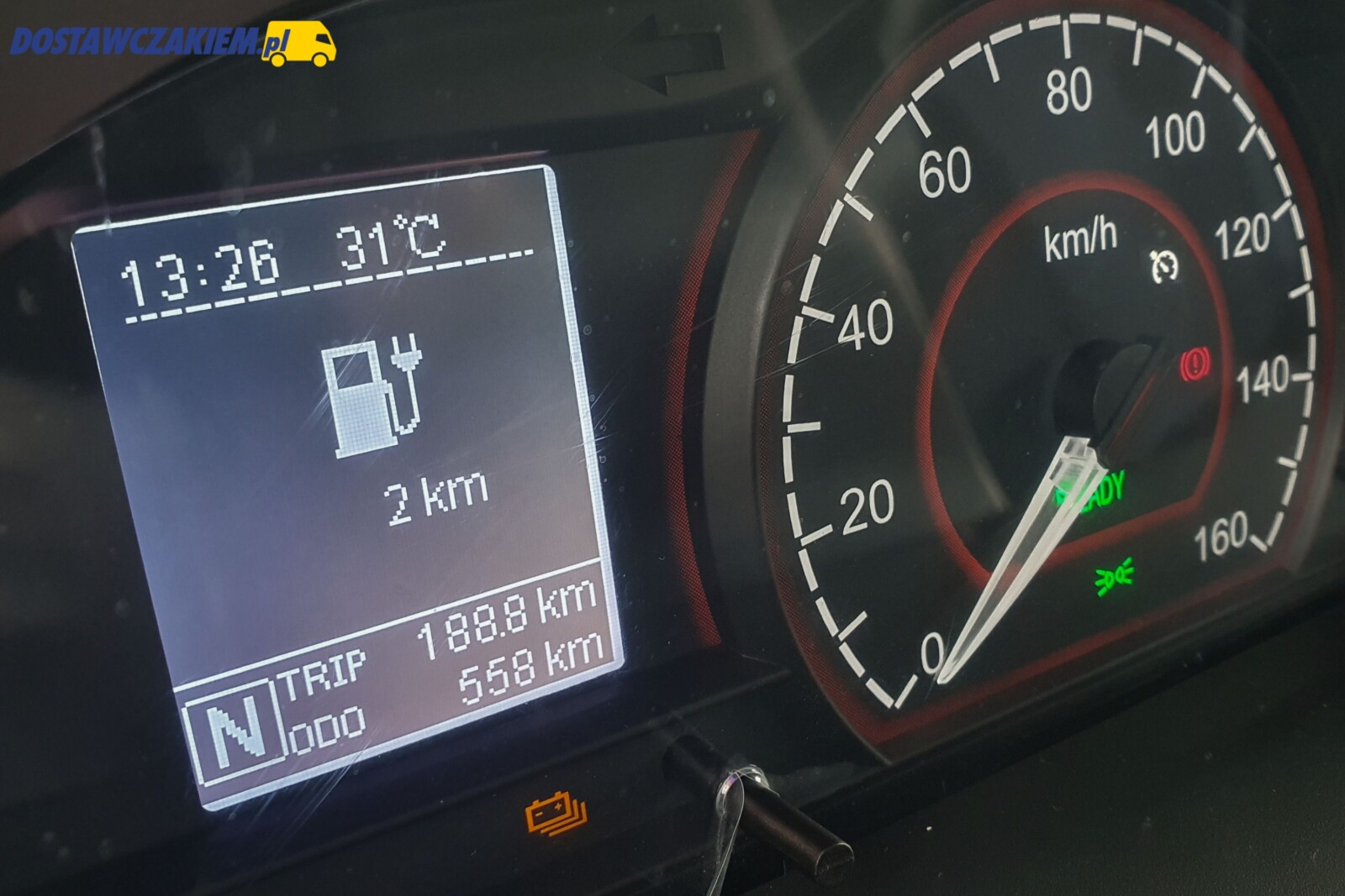 W przypadku Maxusa e-Deliver 3 mamy i analogowy prędkościomierz, choć po jego lewej stronie znajduje się cyfrowy wyświetlacz komputera pokładowego, który z kolei obsługuje się – niczym w starych japońskich autach – wystającymi bolcami. Mało to ergonomiczne rozwiązanie, którego chyba już się nie stosuje.