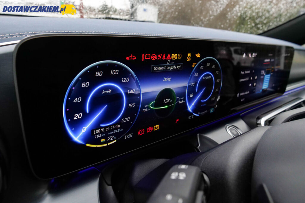 Jeżeli więc zimą będziemy chcieli pojechać drogą krajową trzymając się obowiązujących limitów prędkości, to bez problemu możemy uzyskać wynik oscylujący w granicach 30-31 kWh/100 km. Jeżeli jednak wjedziemy na drogę szybkiego ruchu, to zużycie energii wzrośnie do 34-35 kWh/100 km. I mowa tutaj o w pełni załadowanym EQV pod dopuszczalną masę całkowitą, która wynosi 3500 kg.