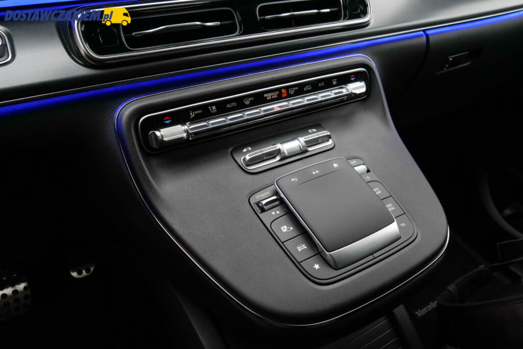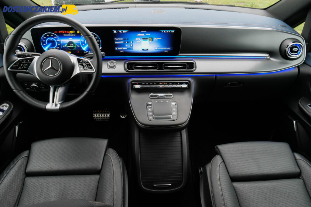 W środku EQV po kuracji odświeżającej wygląda mocno futurystycznie. Deska rozdzielcza obszyta skórą skrywa w sobie dwa wyświetlacze, każdy o przekątnej 12,3 cala. Ten przed kierowcą to po prostu cyfrowy kokpit a na środku dotykowy ekran obsługuje system infotainment MBUX (z ang. Mercedes-Benz User Experience).