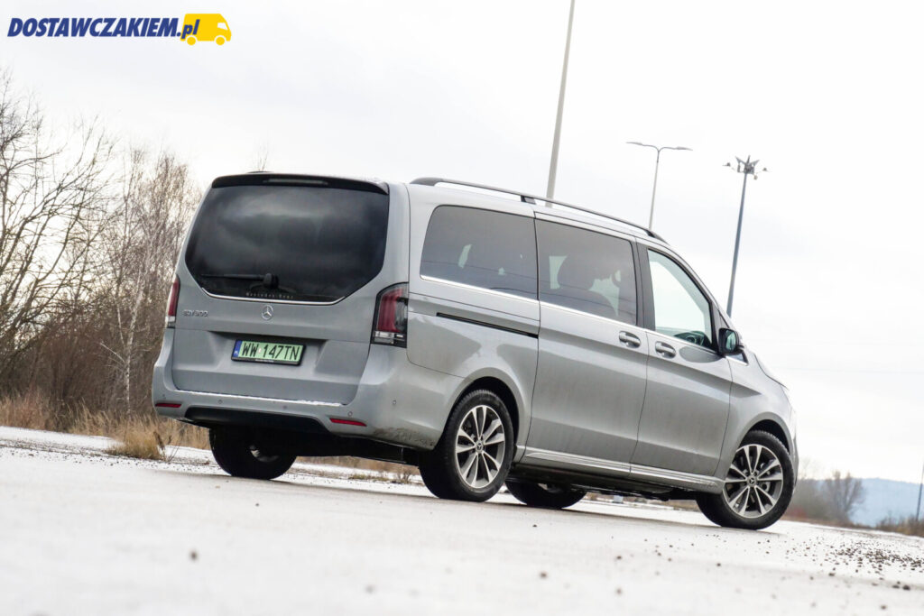 Z zewnątrz tylko klapa gniazda ładowania umieszczona po lewej stronie przedniego zderzaka zdradza, że mamy do czynienia z elektrycznym minibusem. No dobra, zielonych tablic nie sposób nie zauważyć, ale warto też wiedzieć, że do EQV nie zamówimy większych obręczy niż 18-calowe. Prezentowany pojazd posiadał właśnie takie aluminiowe felgi z oponami 245/50/18R.