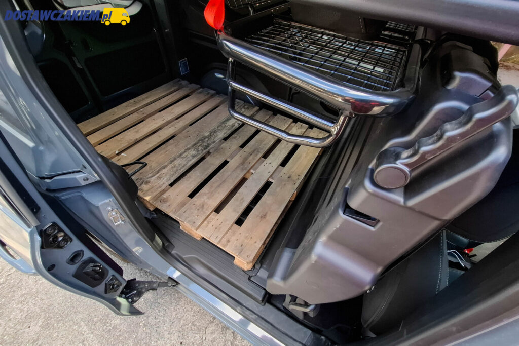 Jeżeli jednak będziemy chcieli załadować te dwie europalety do Citana Mixto, to trzeba pamiętać, że kratka przy złożonej pionowo kanapie ogranicza wysokość towaru przewożonego na tej palecie bliżej kierowcy i pasażera.