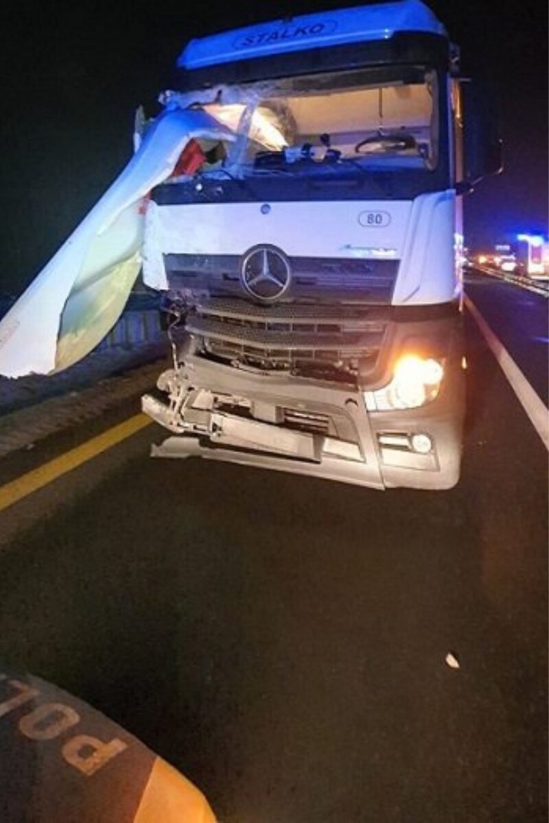 Siła uderzenia musiała być znaczna, bo Iveco zepchnięte zostało z drogi, a część izolowanego kontenera wbiło się w kabinę ciężarówki.