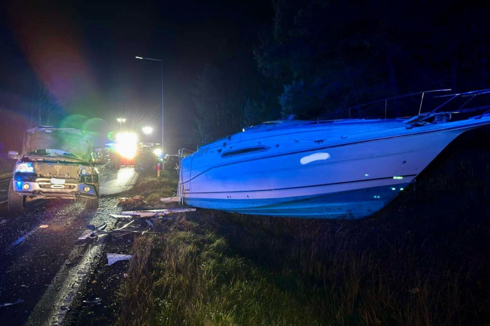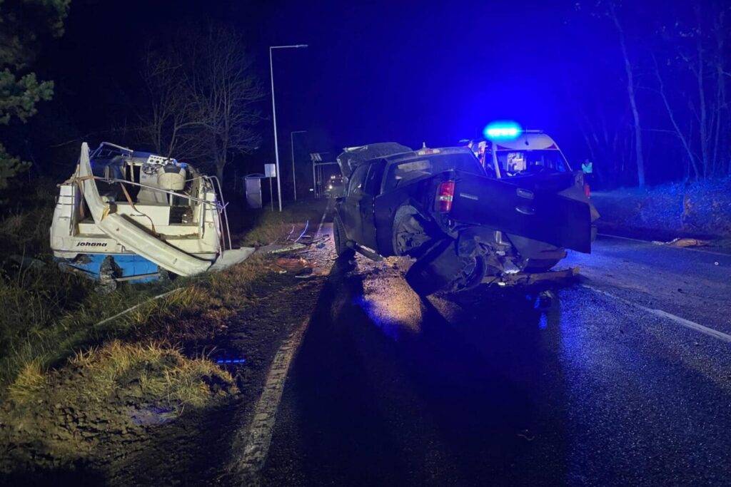 Wtedy ciągnięta na przyczepie za pick-upem łódź wyrzucona została w wprost w osobowego Seata Leona, którym podróżowały trzy osoby.
