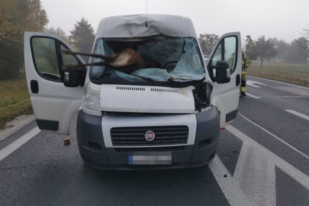Bardzo niebezpieczna sytuacja na DK 19 z udziałem dzikiego zwierzęcia. Potrącony jeleń wpadł do kabiny przez przednią szybę Fiata Ducato.