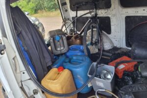 W trakcie zatrzymania wytypowany sprawca kradzieży przewoził w ładowni Mercedesa Vito ręczną pompkę do spuszczania paliwa oraz sporo baniek o łącznej pojemności kilkuset litrów z resztkami oleju napędowego.