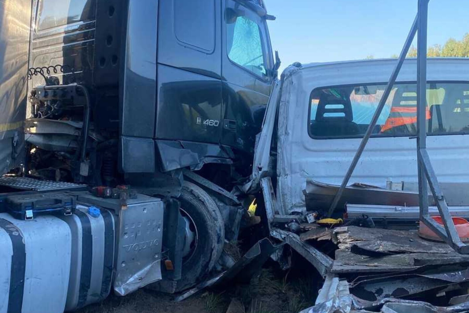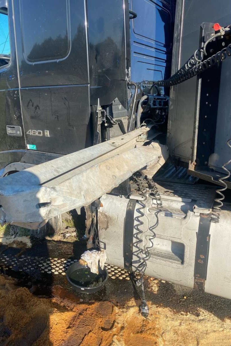 Kiedy strażacy kończyli przepompowywanie paliwa z ciągnika, w pomarańczowego busa „drogowców” najechał inny zestaw – kierowca ciągnika został zaklinowany w kabinie Mercedesa.