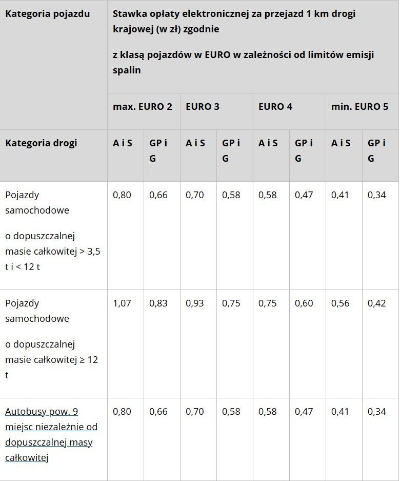 Oznacza to, że przedsiębiorstwa posiadające pojazdy m.in. ciężarowe oraz kierowcy busów jeżdżący z przyczepami/naczepami, ale także i kierowcy ciągnący całkowicie prywatnie na przyczepie skuter śnieżny czy konie powinni zapoznać się z nowymi stawkami (kiedy dopuszczalna masa całkowita lub dopuszczalna masa całkowita zespołu pojazdów przekracza 3,5 tony).