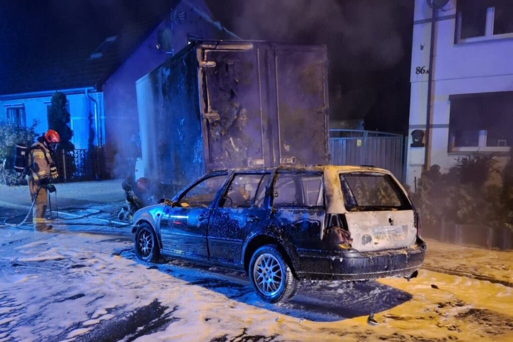 Jak ustaliła tamtejsza policja, około godziny 23.00 w stojącego przy ulicy „LT-ka” uderzył Volkswagen Golf a następnie doszło do pożaru obu pojazdów. Na miejsce zdarzenia udały się jednostki straży pożarnej oraz policja.