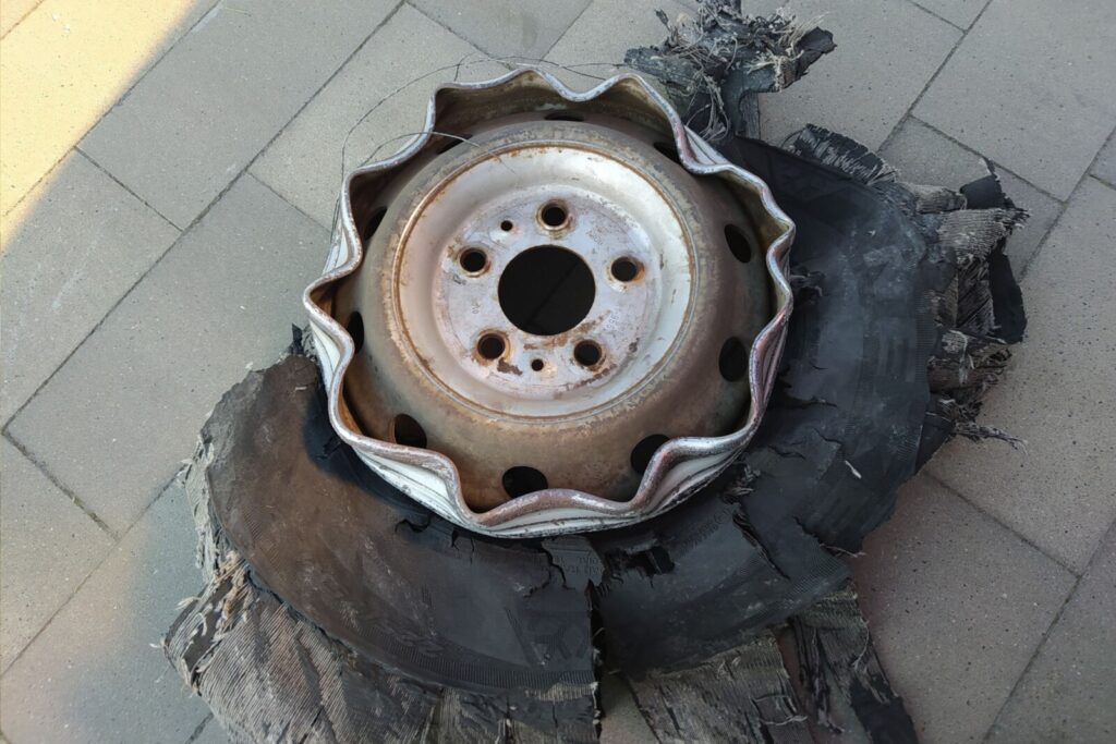 Dzięki uprzejmości Pomocy Drogowej Adamos pozwoliłem sobie opublikować zdjęcia obrazujące jak wyglądały resztki opony i felga „X250-tki”.