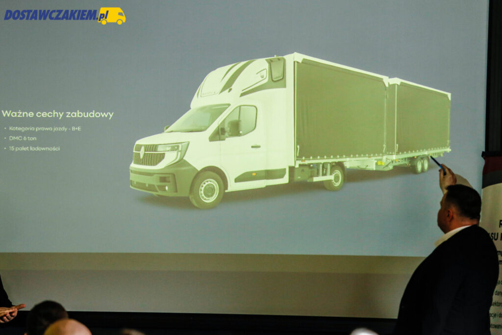 Następnie przedstawiciele firmy Carpol przedstawili na prezentacji zamysł wprowadzenia do stałej oferty 15-paletowego zestawu na prawo jazdy B+E. Taki zespół pojazdów składać się ma z „międzynarodówki” na podwoziu Renault Master oraz z przyczepy. W tym wypadku DMCZ wynosi 6000 kg, ale zabudowca z Grodziska Mazowieckiego może rozszerzyć ofertę o inne modele pojazdów dostawczych oferujących DMCZ do 7000 kg.