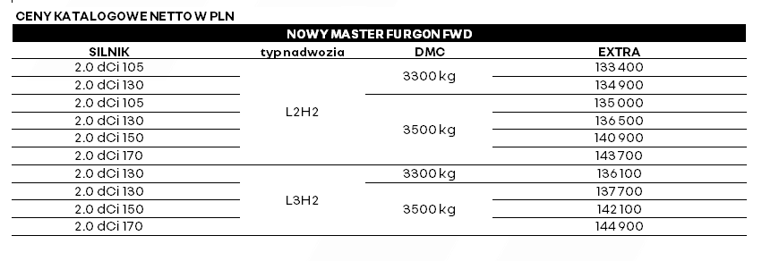 Cennik nowego Renault Master z typoszeregu XDD startuje od 133 400 zł netto za L2H2 z silnikiem 2.0 dCi 105. Auto pojawić się ma we wrześniu.