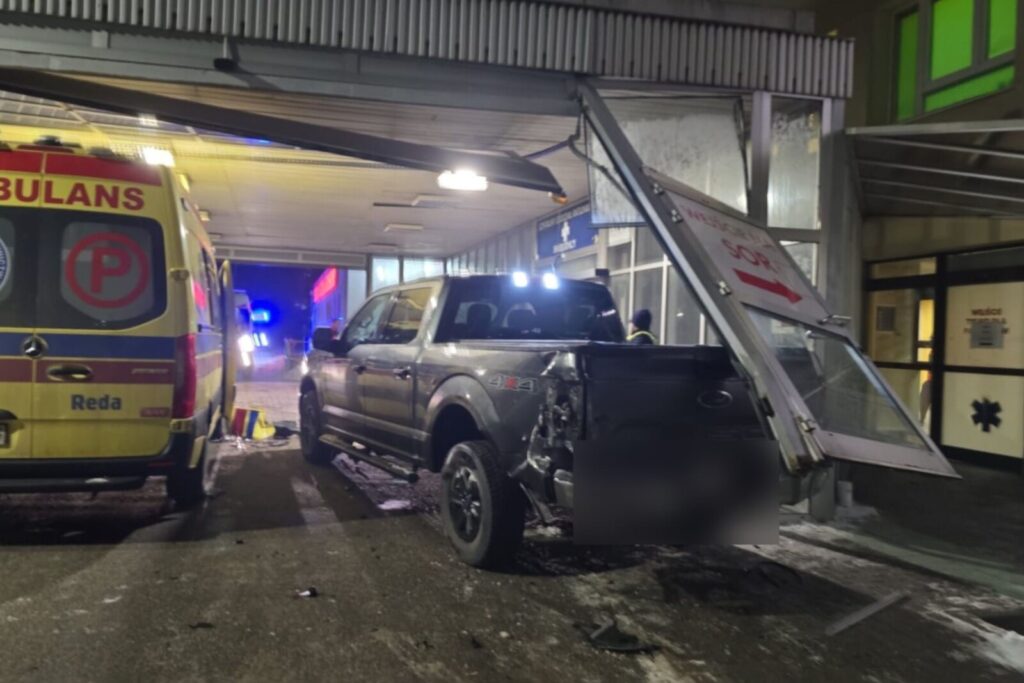 Do nietypowego zdarzenia doszło na SOR-rze w Wejherowie. Pick-up staranował wjazd na SOR i karetkę. Wszystko przez… pasażerkę.