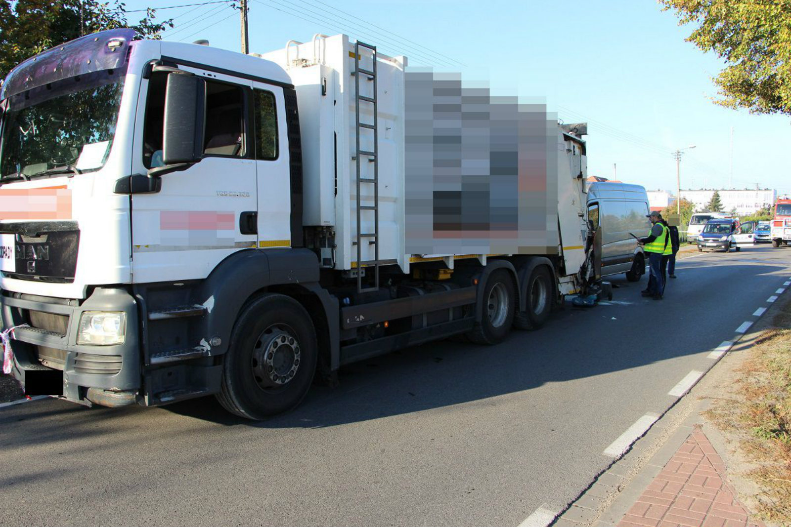 Akurat w momencie uderzenia dostawczego Mercedesa w tył ciężarowego MAN-a śmieci z kubłów wyrzucał 43-letni pracownik firmy komunalnej.