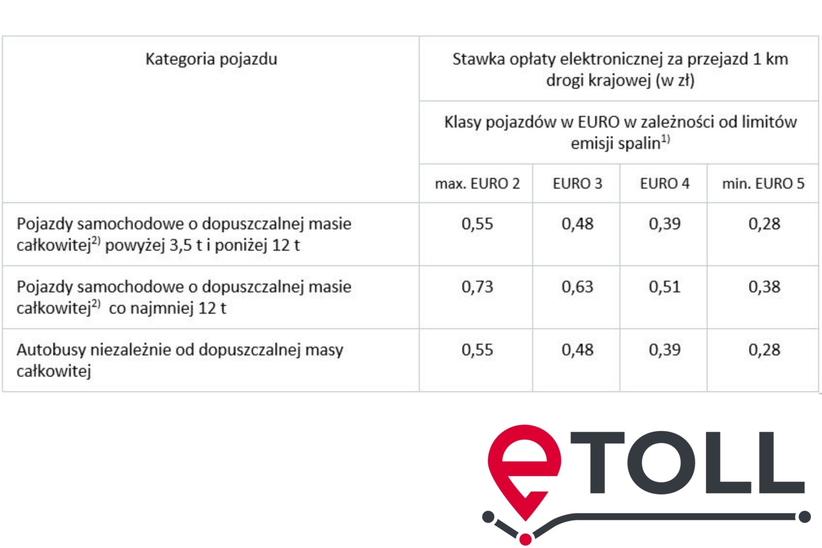 W przypadku pojazdów (i zespołów pojazdów) powyżej 3,5 tony do 12 ton każdy kilometr przejazdu autostradą lub drogą ekspresową kosztować będzie użytkownika w zależności od normy emisji spalin silnika: