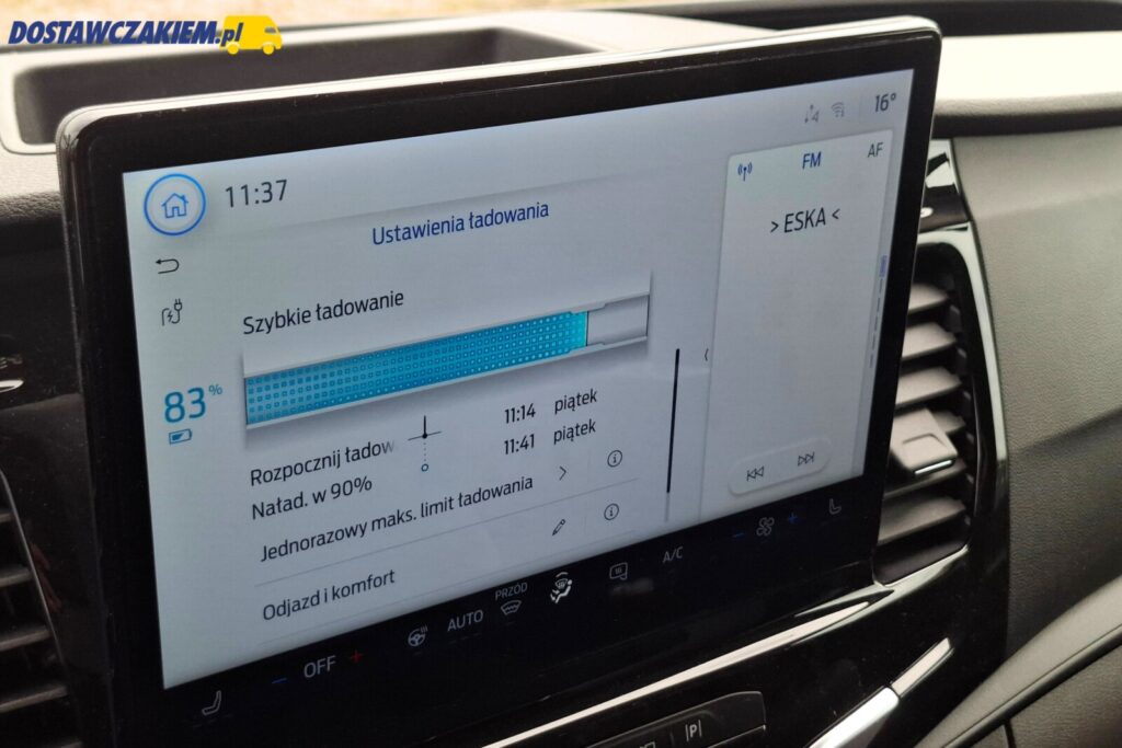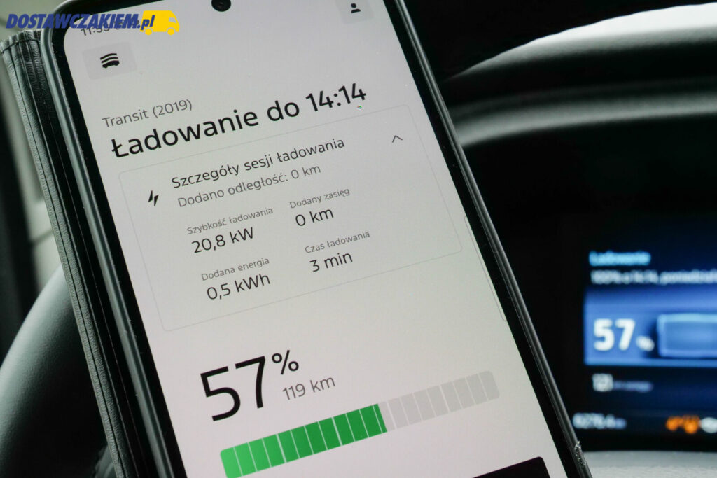 Na początek warto jednak przypomnieć, że testową sztuką jest E-Transit z baterią 89 kWh oraz z silnikiem o mocy 184 KM, który generuje do 430 Nm. Ford E-Transit występuje w dwóch wersjach wyposażeniowych – Trend i Limited – a prezentowana „blaszka” to bazowy wariant Trend z wieloma dodatkowymi elementami wyposażenia.