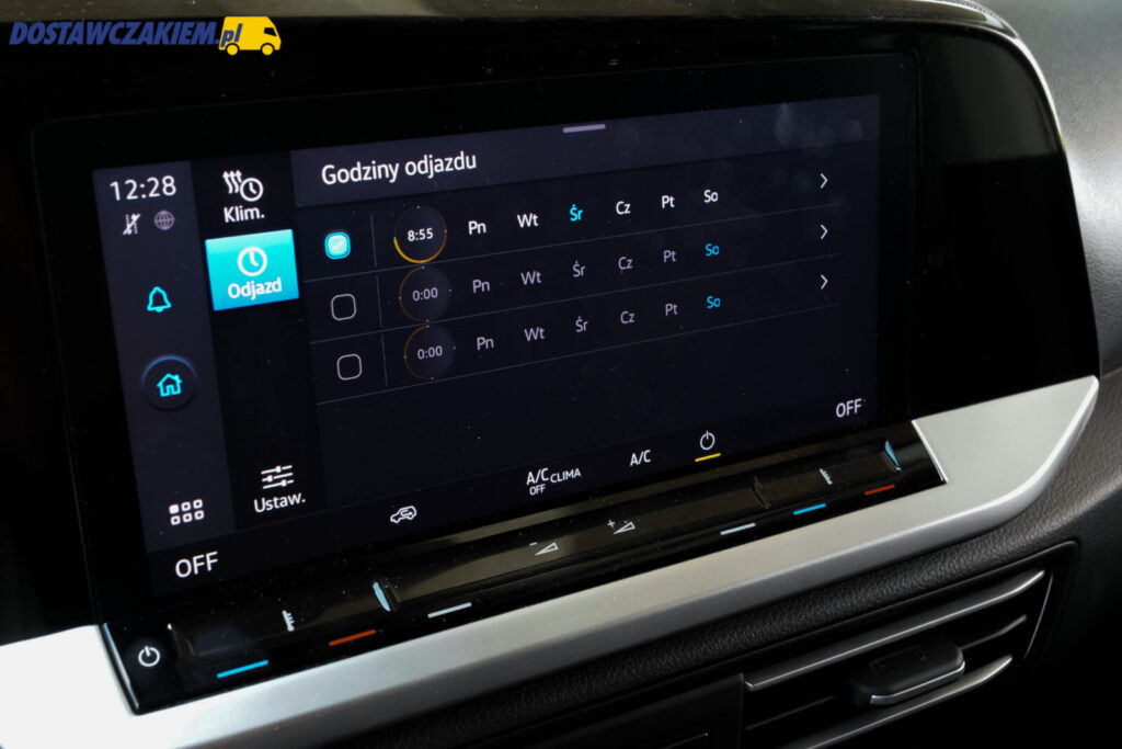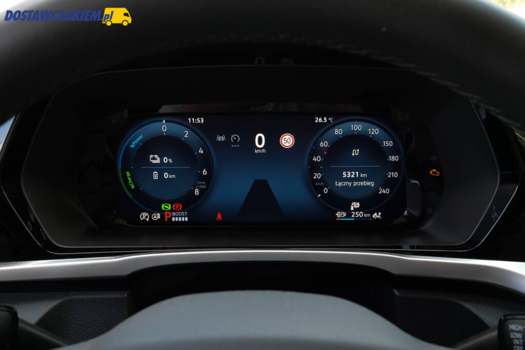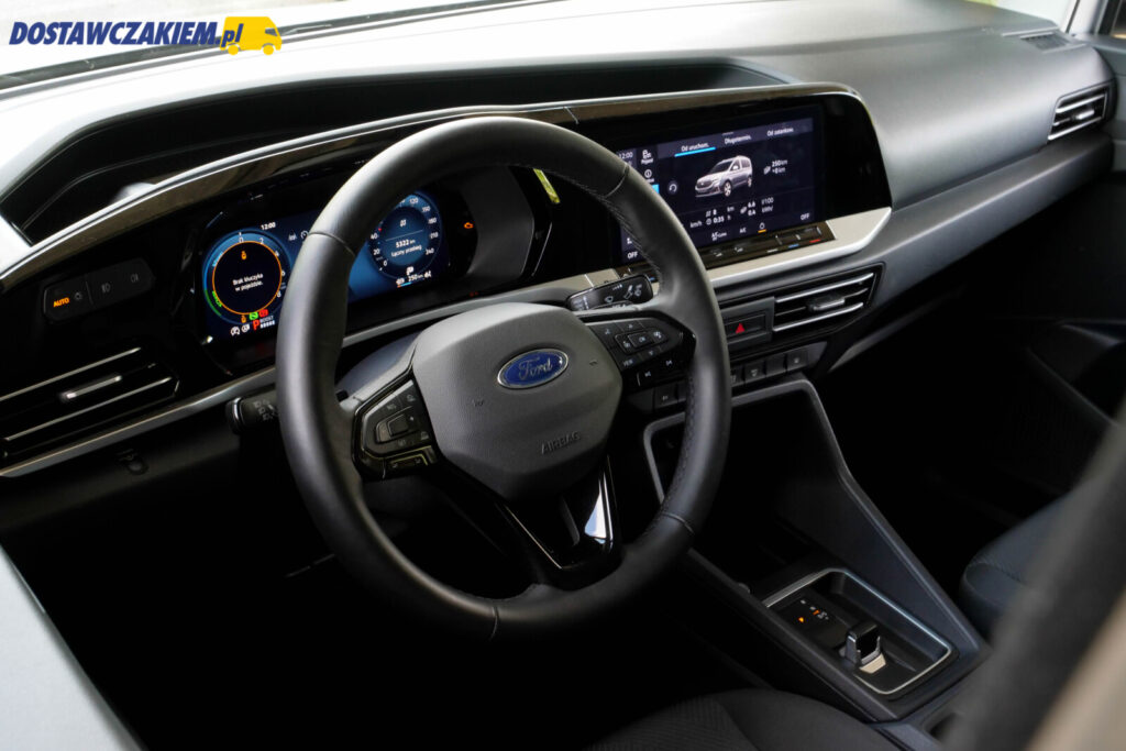 O ile Transit Connect z silnikiem Diesla w bazowym wariancie Trend ma w serii manualną klimatyzację, to w przypadku hybrydy otrzymujemy automatyczną 2-strefową klimatyzację. Do tego hybryda ma też w wersji Trend przycisk Start/Stop czy cyfrowy zestaw wskaźników o przekątnej 10,25 cala, którego wygląd wraz z przekazywanymi danymi, możemy dopasować pod własne preferencje.