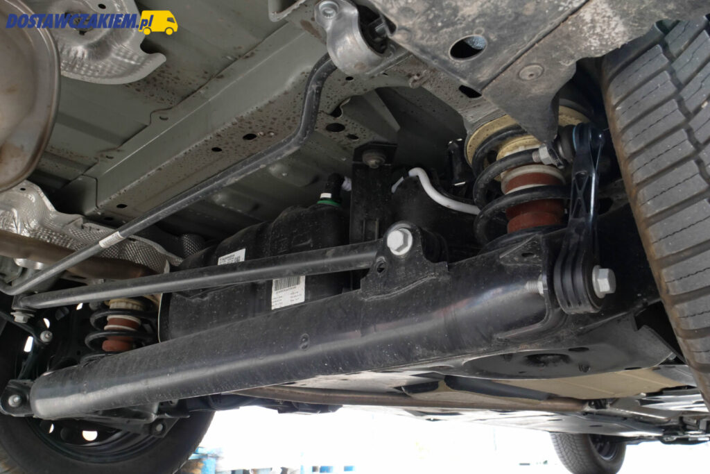 Z tego też powodu pod tylną częścią podwozia nie znajdziemy koła zapasowego – nie jest w ogóle dostępne w hybrydowej odmianie Transita Connect nawet w opcji. Jednak mamy pod fotelem pasażera fabrycznie montowany zestaw naprawczy do opon w zamian.